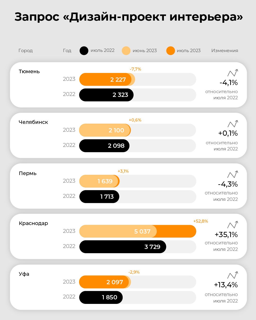 В Краснодаре, напротив, отмечается значительный рост спроса на проектирование. По сравнению с показателями июля 2022 запросы на дизайн-проект интерьера здесь вводили на 35% чаще. В Казани и Уфе также отмечается рост — на 19% и 13% соответственно. В Челябинске спрос по теме остался на прежнем уровне.