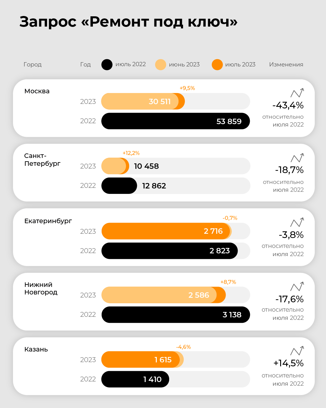 В группе запросов, которые касаются ремонта, в целом наблюдается положительная динамика. Особенно сильный прирост запросов — в Перми. По сравнению с данными за июль 2022 года здесь спрос на ремонт вырос на 27%. По сравнению с июньскими данными текущего года спрос на ремонт под ключ вырос в Уфе и Тюмени — на 25% и 23% соответственно.